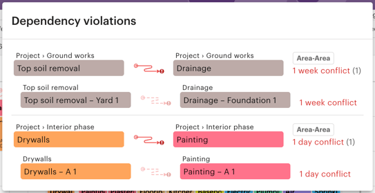 As you edit the schedule, you can view all dependency violations by clicking the dependency button in the top bar. This opens a list of all current issues.