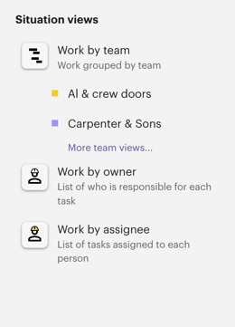 Situation views can be used to sort work packages in order by the team, owner or assignee of the work package. These are similar to the Pivot by team, owner or assignee function available in the current version of Sitedrive.