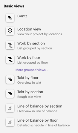 Basic views cover different schedule types at multiple levels: Gantt, Takt, and Line of Balance. The Location view is a new option that lets you see the schedule at a higher level in a location-based format and closely resembles the Takt view.