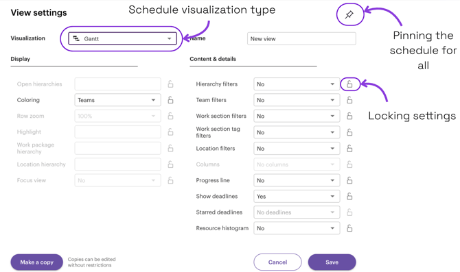 - Choose the schedule visualization (Gantt, Takt, LoB, etc.)