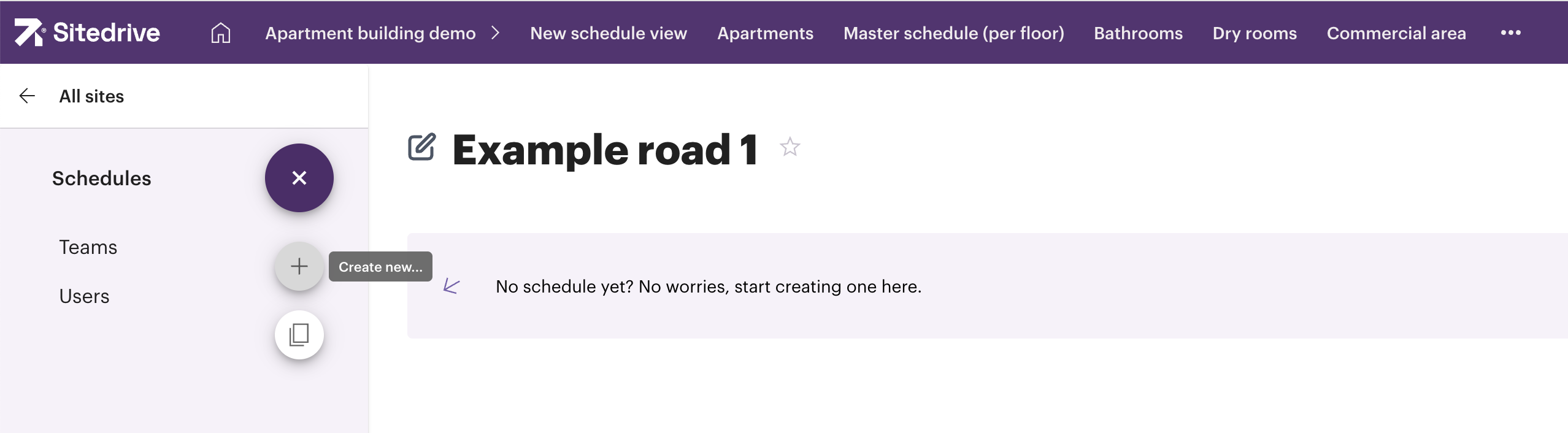 In Sitedrive, sites correspond to a construction project or high-level project, while schedules can manage various stages of a construction project such as design, production, and warranty phase.