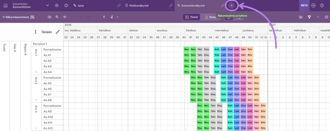 Voit aina avata ja sulkea välilehtiä tarpeen mukaan ilman, että tietoja katoaa. Vain kiinnitetyt aikataulunäkymien välilehdet pysyvät avoinna kaikille käyttäjille.