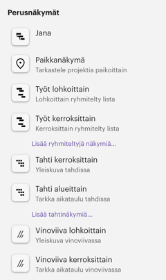 Perusnäkymät kattavat eri aikataulutyypit useilla tasoilla: jana, tahti ja vinoviiva. Paikkanäkymä on uusi vaihtoehto, jonka avulla voit tarkastella aikataulua ylemmällä tasolla sijaintipohjaisessa muodossa. Se muistuttaa läheisesti tahti-näkymää.
