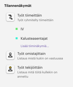 Tilannenäkymissä työpaketit voidaan järjestää tiimin, omistajan tai vastuuhenkilön mukaan. Ne vastaavat nykyisen Sitedrive-version Pivot tiimeittäin, omistajittain tai tekijöittäin -toimintoja.