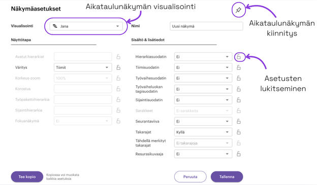 Kaikki käyttäjät, joilla on pääsy aikatauluun, voivat luoda uusia aikataulunäkymiä. Alemman tason käyttäjät voivat kuitenkin muokata vain itse luomiaan näkymiä. Hanke ja aikataulutatason käyttäjät voivat muokata kaikkien aikataulunäkymien asetuksia.
