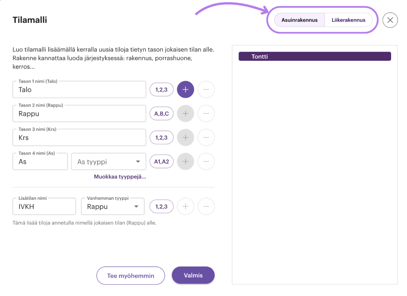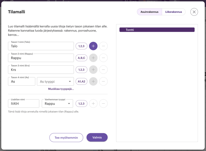 Tilamallin luontityökalulla voit lisätä useita sijainteja kerralla. Tämä helpottaa tilamallin tekemistä erityisesti silloin, kun projektissa on paljon toistuvia tiloja. Voit tehdä muutoksia tilamalliin myös myöhemmin.