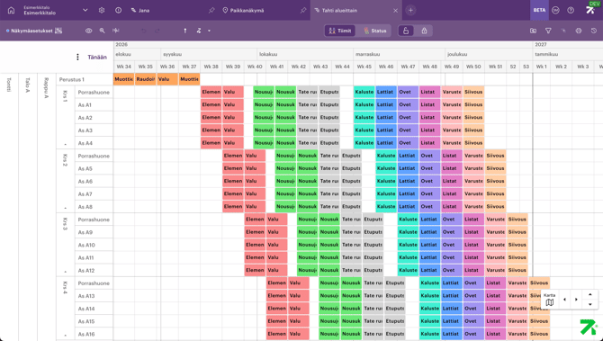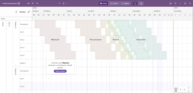 Uudessa betatilassa suosittelemme käyttämään aikataulumallia, jotta saat aikatauluun mukaan perusvaiheet ja työpaketit. Mallipohjan käyttö nopeuttaa oman aikataulun laatimisen aloittamista huomattavasti. Voit muokata näitä työpaketteja myöhemmin vapaasti.