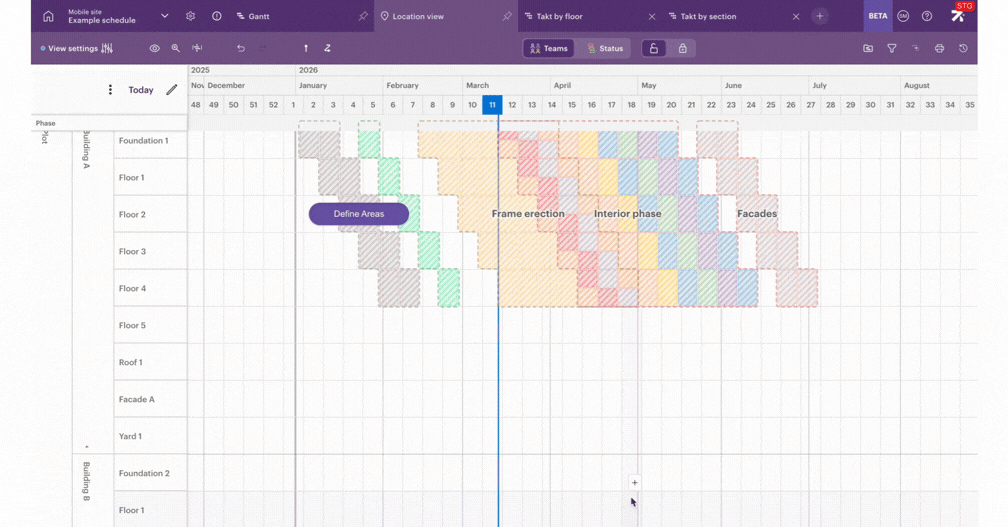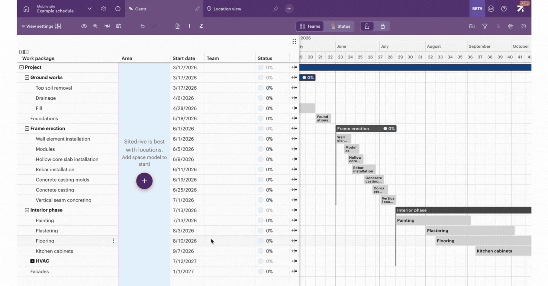 Kun olet lisännyt tilamallin, Sitedrive kehottaa sinua avaamaan Paikkanäkymä-välilehden. Tämä on uusi tapa tarkastella aikataulua, ja sen avulla voit nähdä aikataulun vaihekohtaisesti.