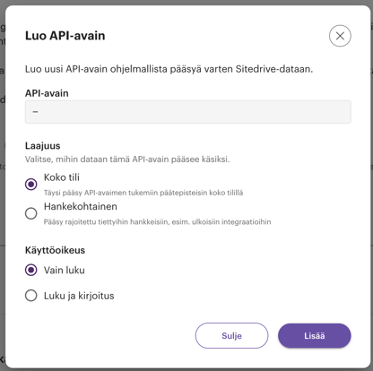 Laajuus-otsikon alta sinun tulee määrittää haluatko antaa API-avaimelle oikeudet kaikkiin tilin hankkeisiin (Koko tili) vai haluatko lisätä oikeuksia vain tietylle tai tietyille hankkeille (Hankekohtainen).