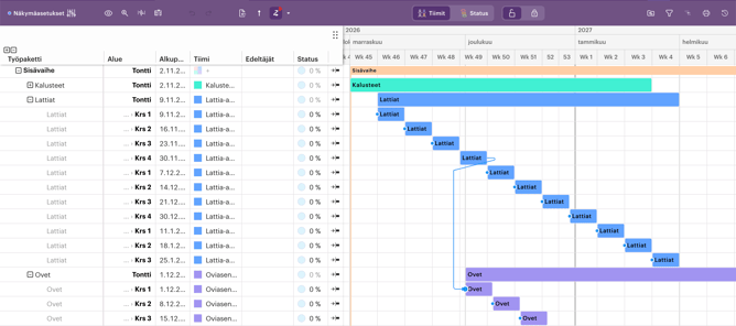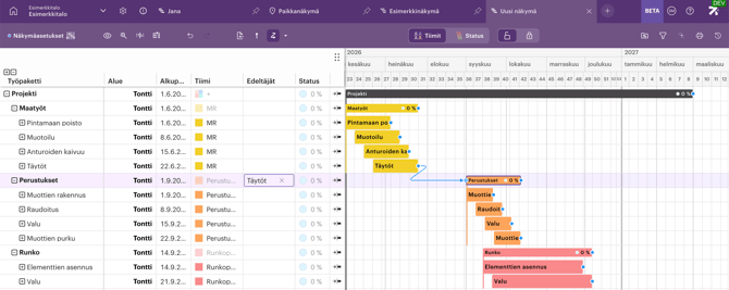 Beta-versiossa voit lisätä riippuvuuksia eri työpakettien välille. Riippuvuudet tarjoavat visuaalisen tavan näyttää, miten työpaketit liittyvät toisiinsa.