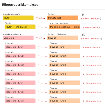 Kun muokkaat aikataulua, voit tarkastella kaikkia riippuvuusrikkomuksia klikkaamalla yläpalkin riippuvuuspainiketta. Tämä avaa listan kaikista tämänhetkisistä ongelmista.