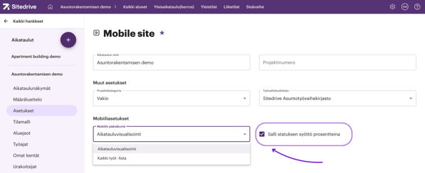Saat raportoitua mobiililla statuksen prosentteina, kun valitset tämän ominaisuuden käyttöön aikataulun asetuksista selainversiossa.