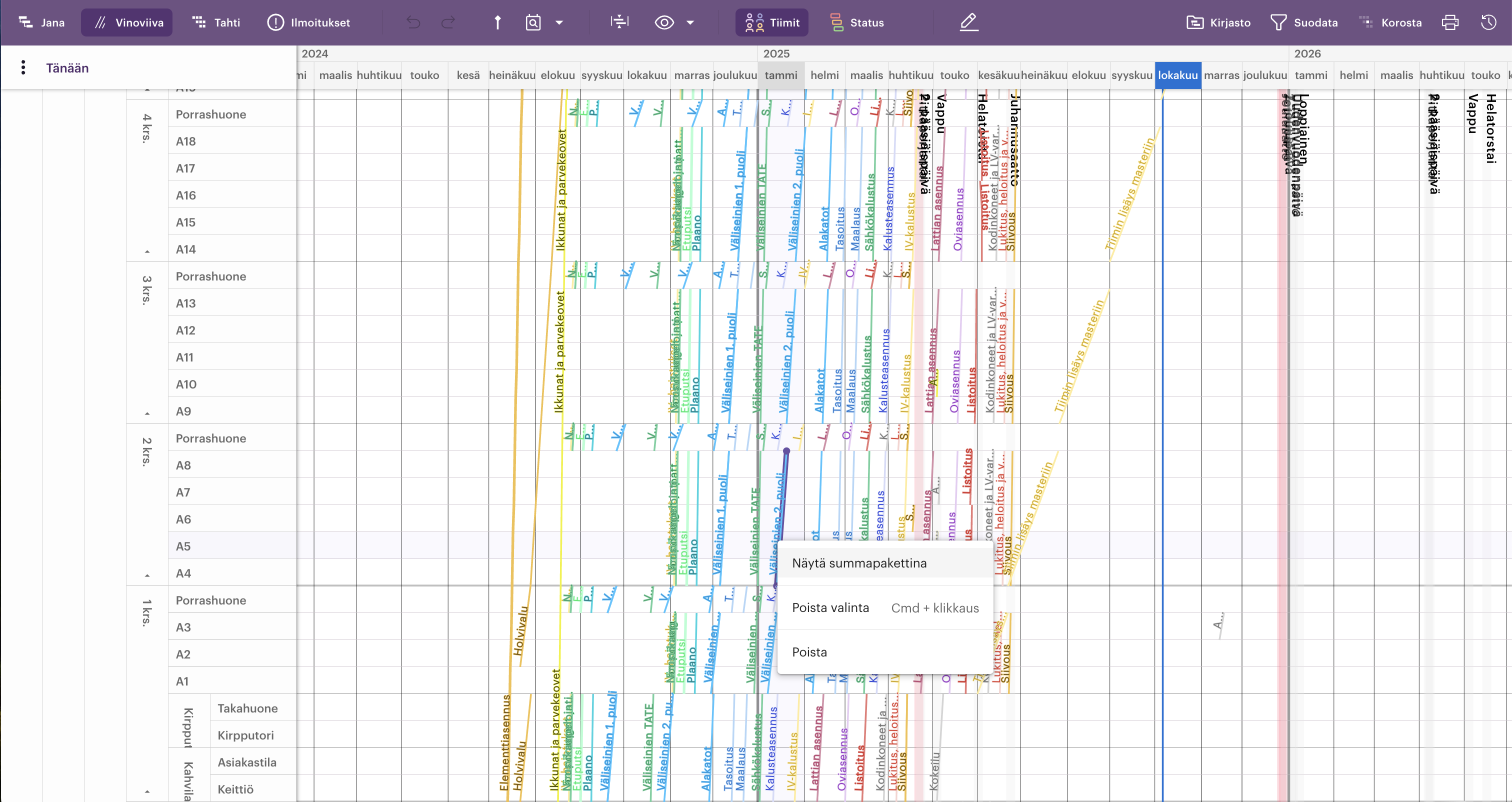 Tässä on tärkeä huomioida aikataulunäkymälle valittu aluejako, jotta työn virtaus saadaan suunniteltua kunnolla. Lisäksi tarkastelua voidaan helpottaa valitsemalla oikea suodattimet.