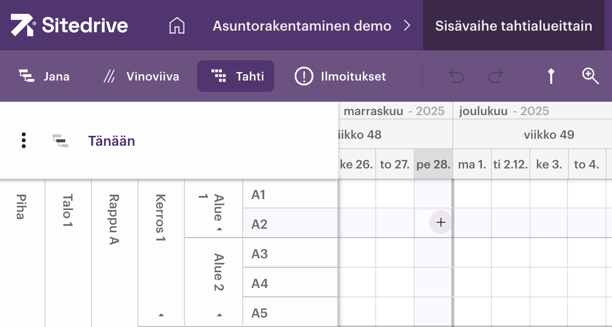- Uuden työpaketin saat lisättyä viemällä hiiren oikean alueen ja ajankohdan päälle ja painamalla +-symbolia. (Jos et näe + symbolia, kannattaa kokeilla zoomata aikataulua.)